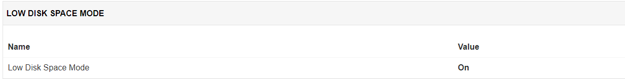 The Low Disk Space mode metric alerts you when the server is running low on disk space, allowing preemptive actions to prevent slowdowns, failures, or data loss due to insufficient storage.