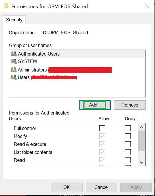 • Under Permissions, enable 'Full control' or 'Modify'.