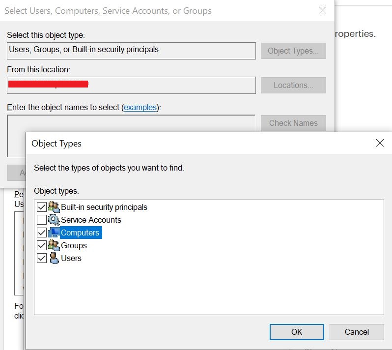 • In the 'Select Users or Groups' panel choose 'Object Types' then Computer' and 'Users'.