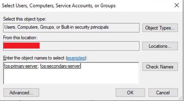 • Specify the primary and secondary server names with which you wish to share the folder. Click on Check Names to select the server name from the list and click ok.