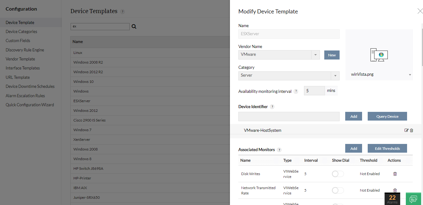 OpManager provides built-in monitoring templates specifically tailored for ESX hosts and VMs. These templates simplify the process of setting thresholds for multiple ESX hosts and VMs simultaneously. Each performance metric allows configuration of both Warning and Error Thresholds, ensuring that proactive alerts are triggered upon violation. This feature streamlines the monitoring setup, allowing you to efficiently manage thresholds across your ESX infrastructure effortlessly.
