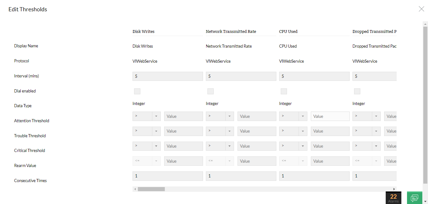 - Click on the monitor name to enable or disable the threshold, and to modify Warning Threshold, Error Threshold and Rearm Values.