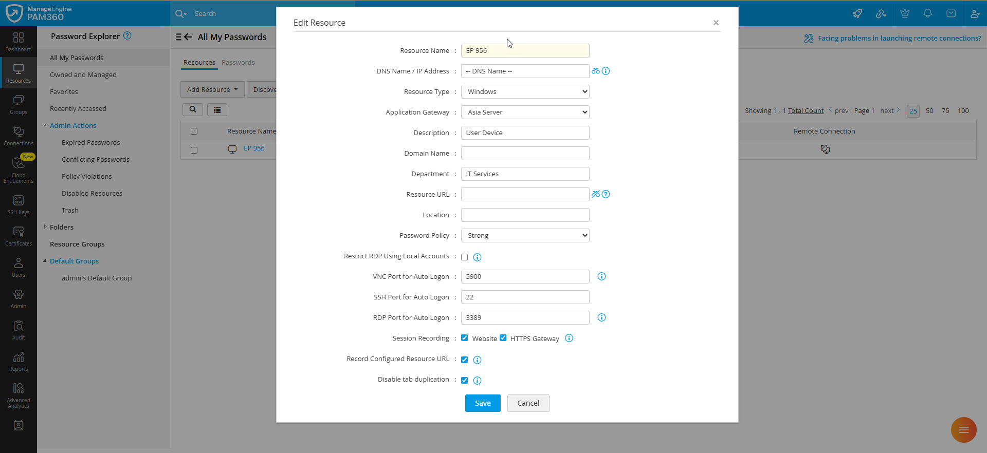 You can delete those resources that are no longer required from the PAM360's Resources list. If you delete a resource, all the accounts and passwords that were part of that resource would also be deleted permanently. Alternatively, you can choose to move a resource to Trash from which it can be restored at a later point of time.