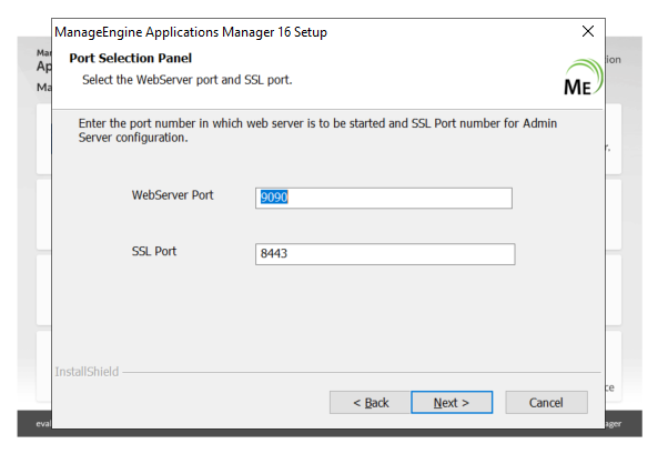 - Enter the WebServer Port number (9090, by default) at which the web server is to be started and SSL Port number (8443, by default) of the web server. Click Next to proceed.