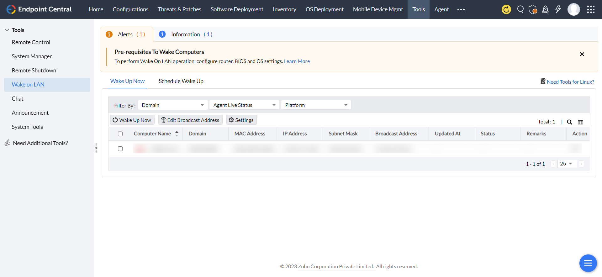 - Navigate to Tools > Wake On LAN > Select the required computers and click Wake up Now