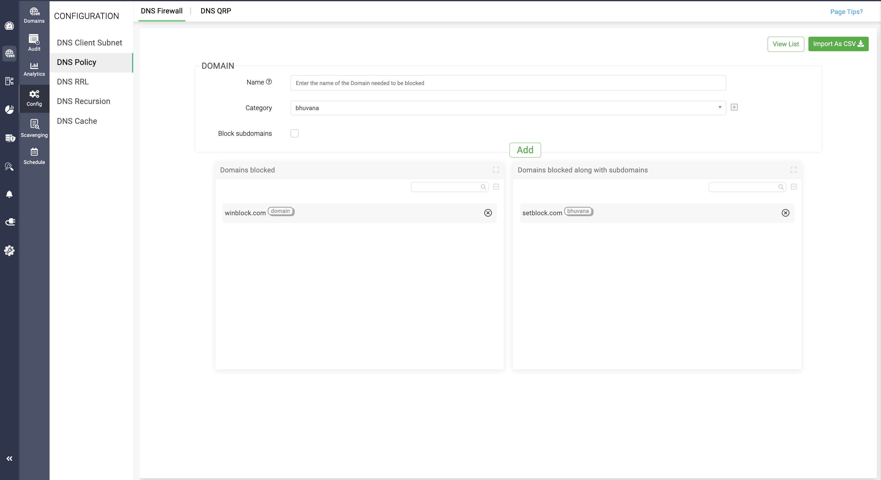 - Once you click Add, you will see two separate lists, one that says Domains Blocked and the other says Domains blocked along with subdomains. This way, you can build your categories of malicious domains on your own.