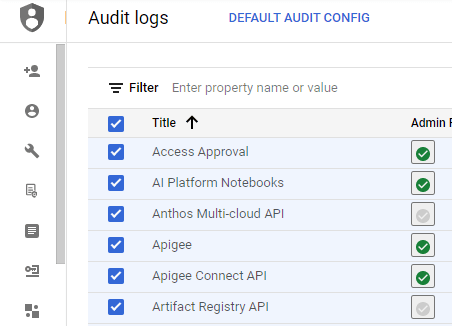 Open the Google Cloud Platform console, select IAM & Admin, scroll down and click on Audit Logs. In the Audit Logs page, click on the check box to the left of the Title to select the services that are available.
