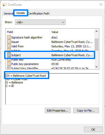 - Copy the Common Name (CN) value. If CN value is not found, specify the value mentioned in Issued To column.