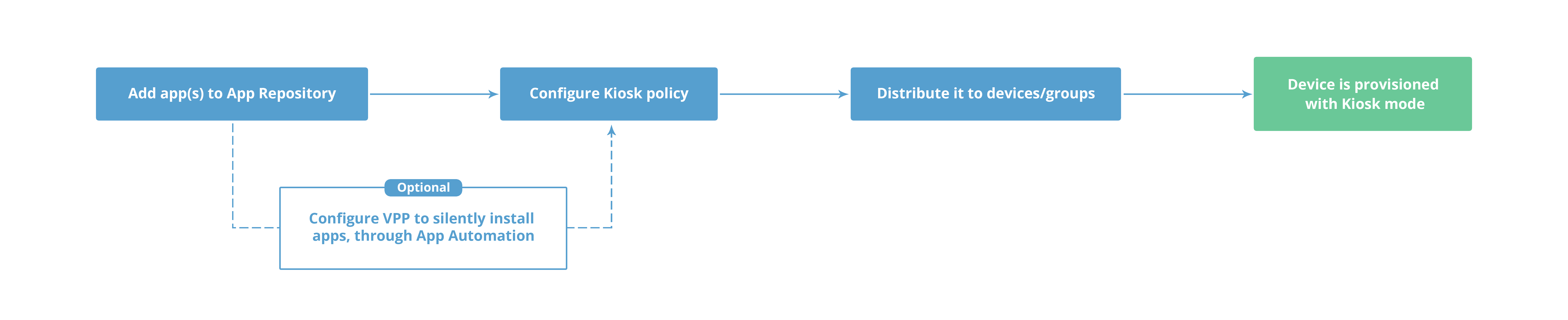 MDM lets you automate installation of apps provisioned in Kiosk (both Store and enterprise apps) to ensure seamless Kiosk profile association. Enterprise apps provisioned in Kiosk will be silently installed on the devices once the profile is distributed to the devices. In case of Store apps, to automate Kiosk app installation, ABM needs to be configured to ensure apps install without requiring Apple ID and only apps purchased through ABM can be installed silently on the devices. You can learn more about silent installation of apps using ABM here.