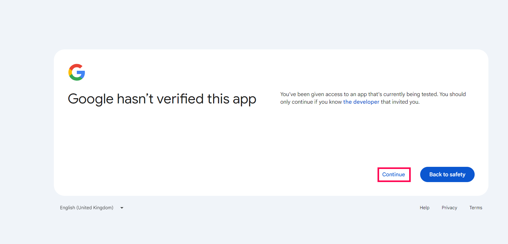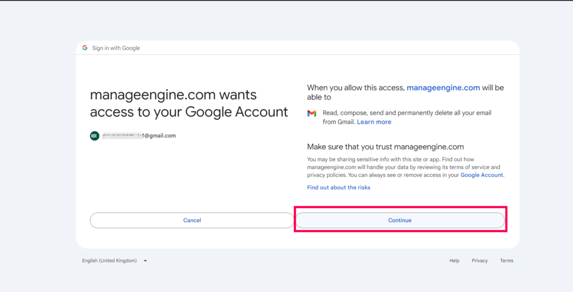 - After providing the above details, save it. You will be redirected to Google Sign in page. Provide Email and Password to Sign in. Then click 'Continue' to provide consent for accessing the application.