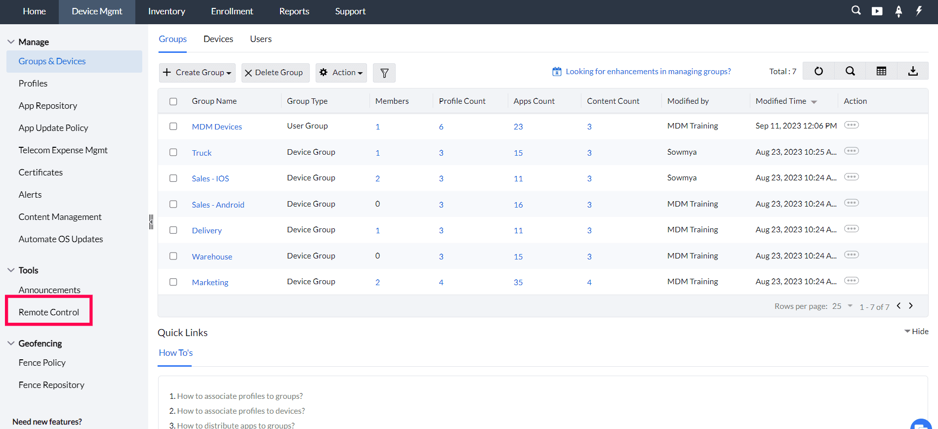 - On the MDM console, click on Device Mgmt from the top menu and select Remote Control.