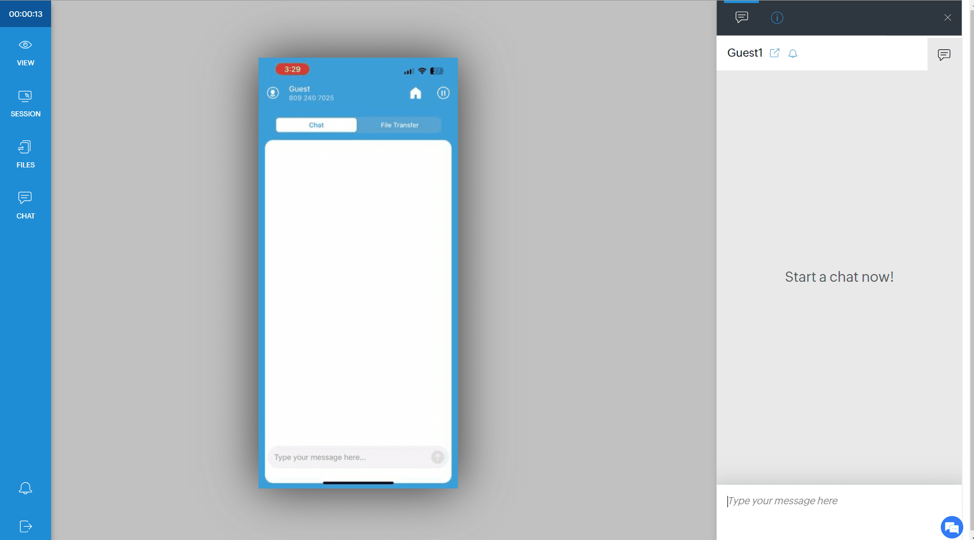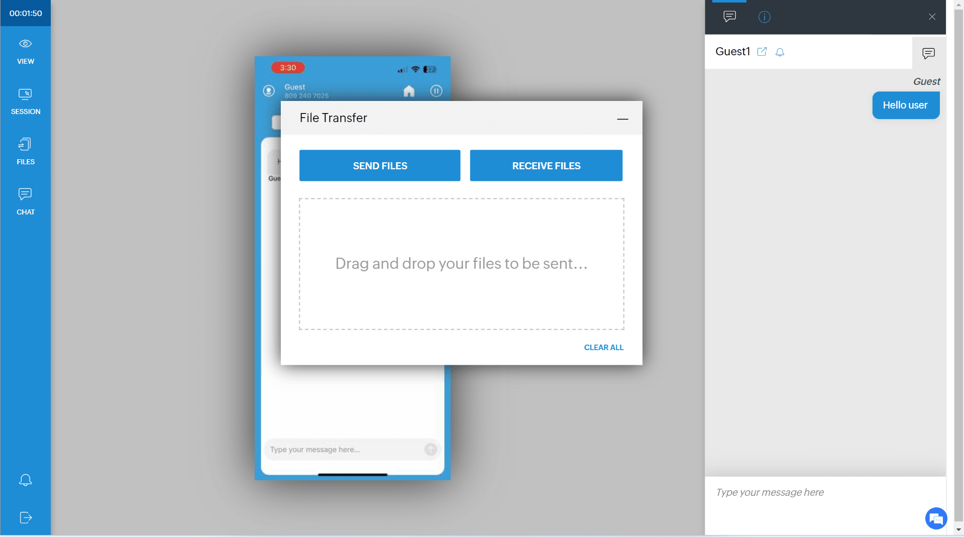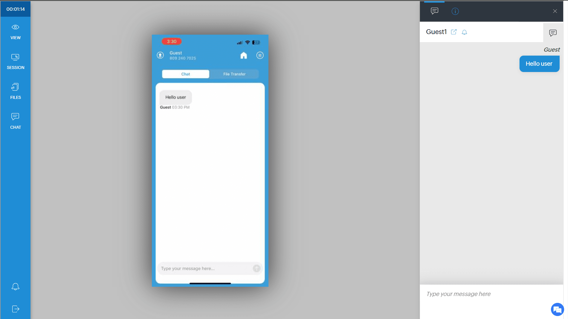 Once the user accepts the remote request, the device screen is displayed, and admins can remotely chat, transfer files during the session.