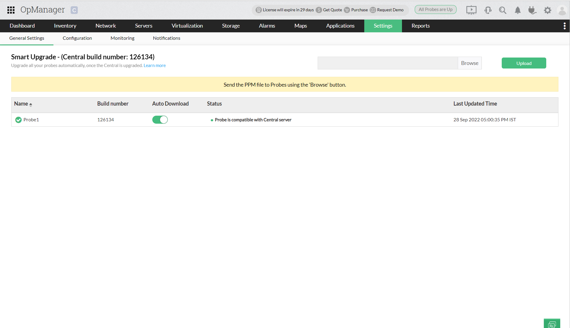 Once the PPM file is uploaded to the Central, the Probes will access the Central to download the PPM files. For seamless operation, the process is organized so that the upgrade button will appear in the Central only after the Probes download the PPM file.