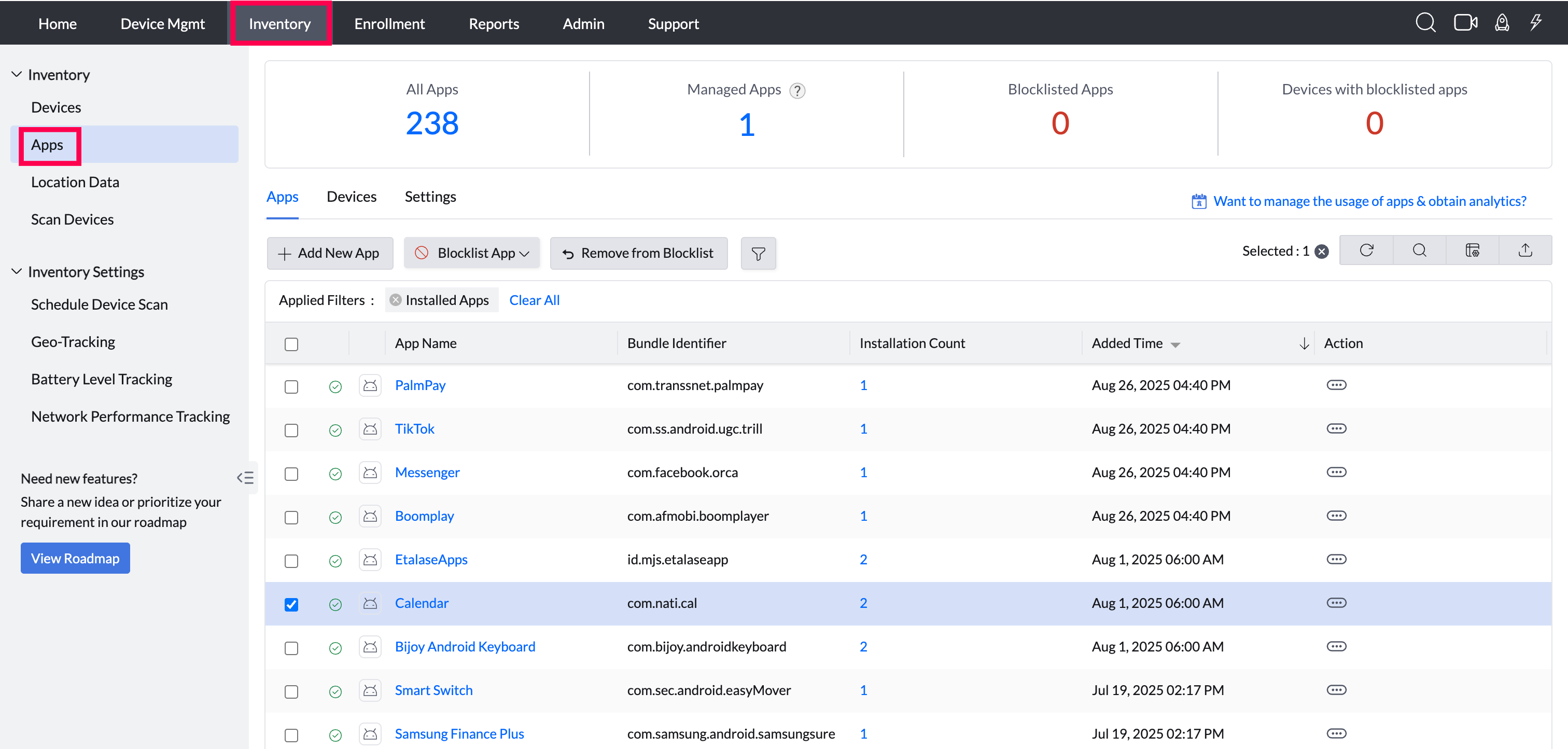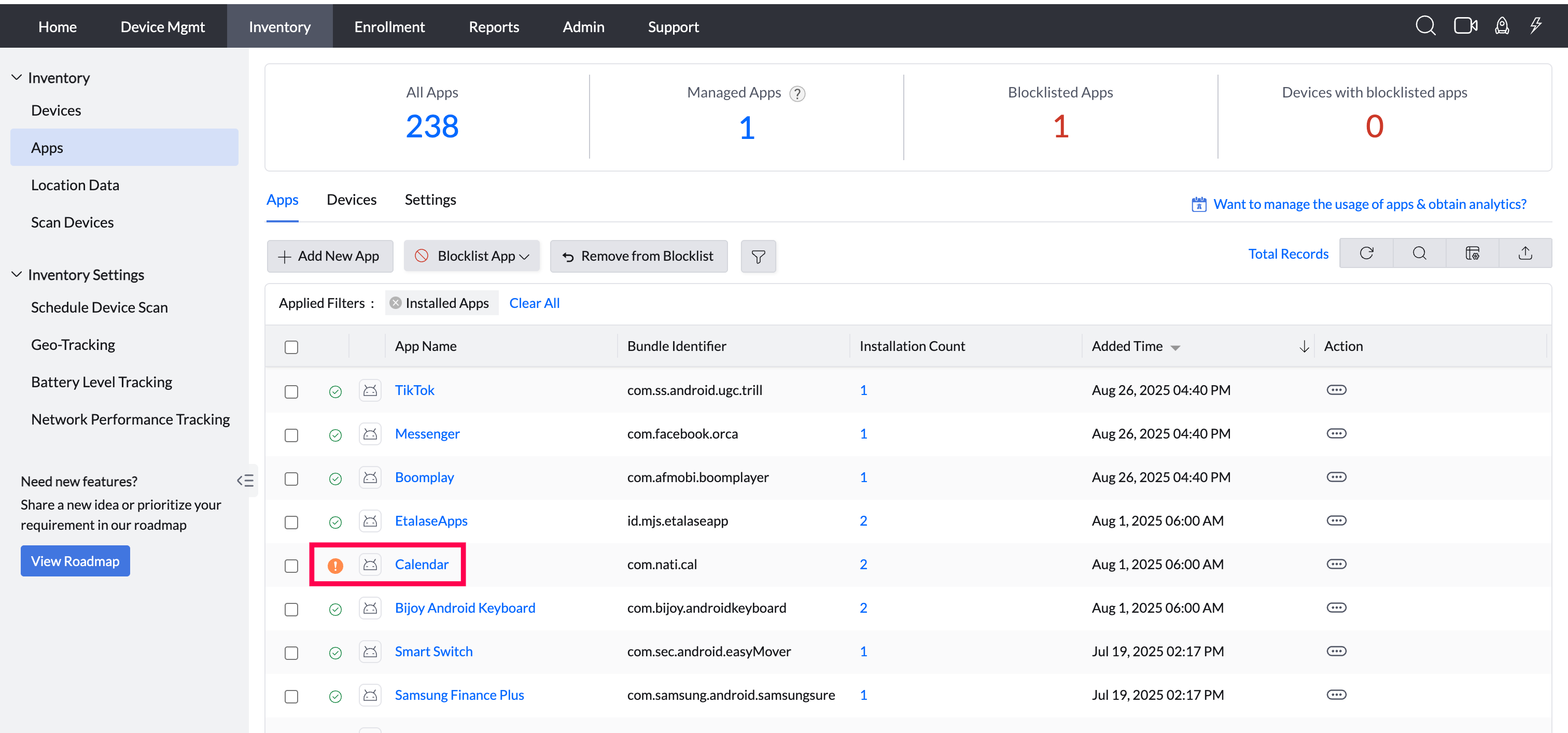 Discovered Apps All the apps present on the device but not managed by MDM. This count is dependent on the Blocklist settings configured.