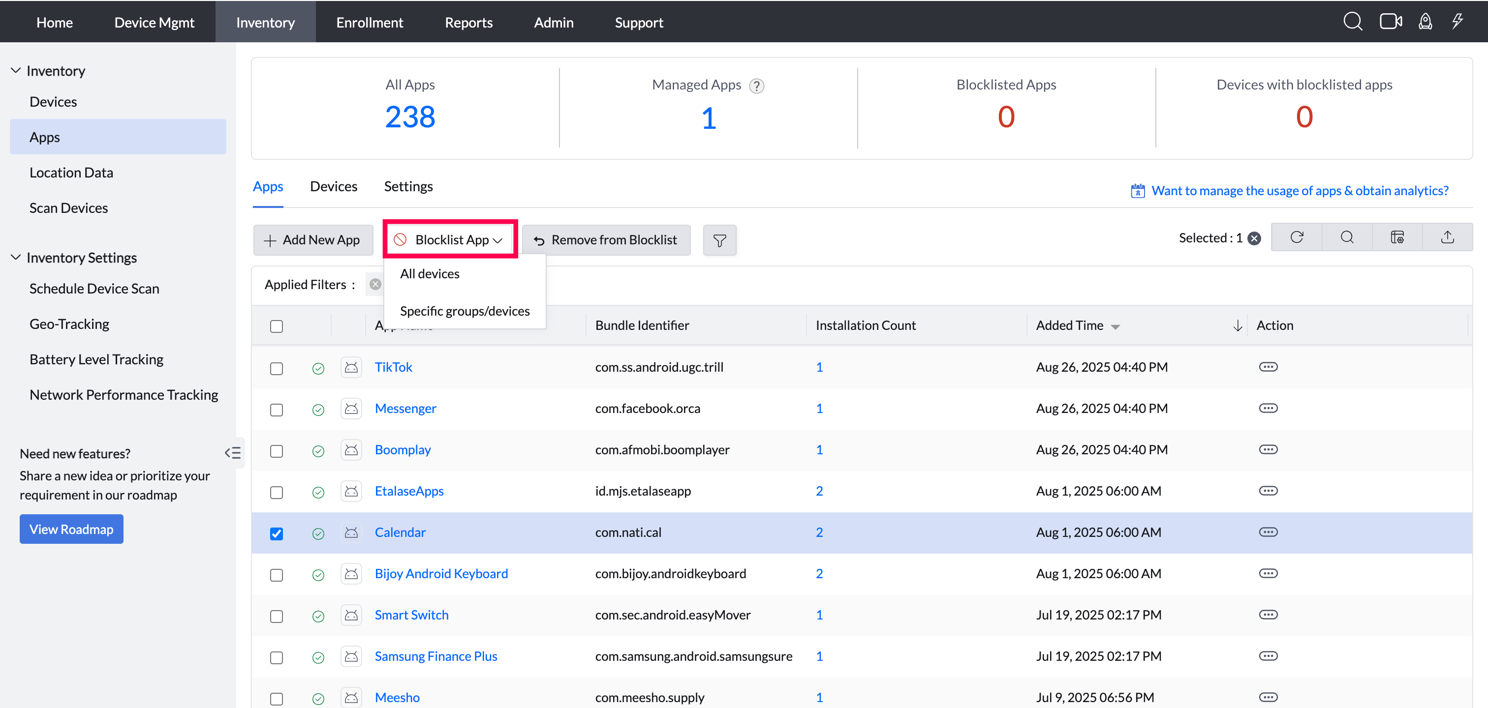 In case your organization is worried about the installation of malicious apps, you would obviously want to disable it across the organization. You can do so by selecting an app or a set of apps and then Blocklist it for all managed devices. It also ensures any device enrolled after the app has been blocklisted, has the app automatically blocklisted.
