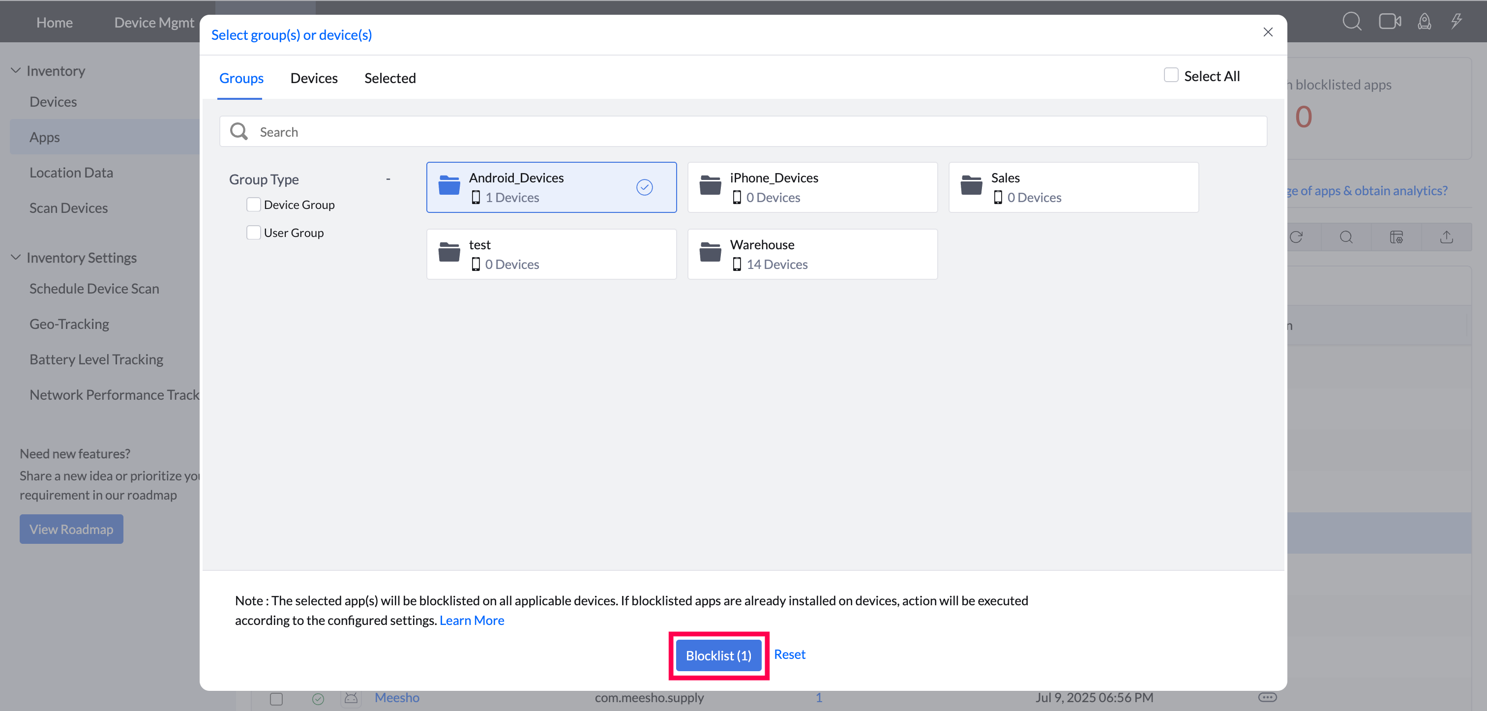 Blocklist apps on specific devices/groups