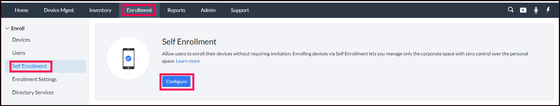1. Configure Self Enrollment Settings: To enable the Self Enrollment feature in MDM, log in to the MDM console using your admin credentials. Navigate to the Enrollment->Self Enrollment. select "Configure." Customize the Self Enrollment settings according to your organization's requirements for seamless device onboarding.
