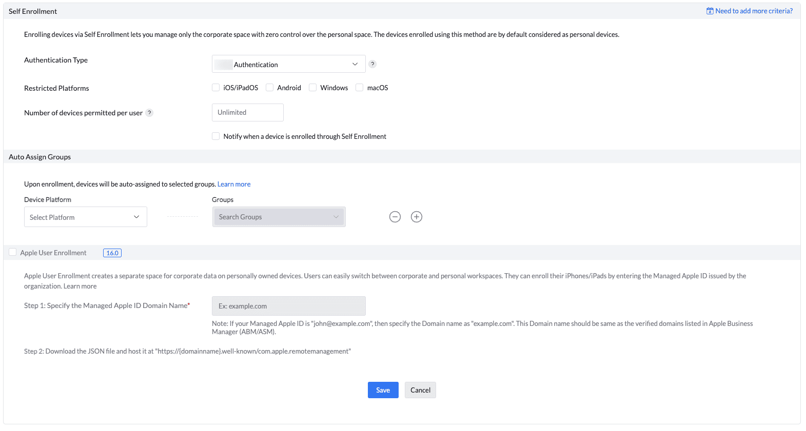 5. Number of devices permitted per user: Self-enrollment enables users to register multiple devices without admin approval. However, for security purposes, most organizations restrict the number of devices a single user can enroll. If the limit is left blank, the device limit is set to unlimited.