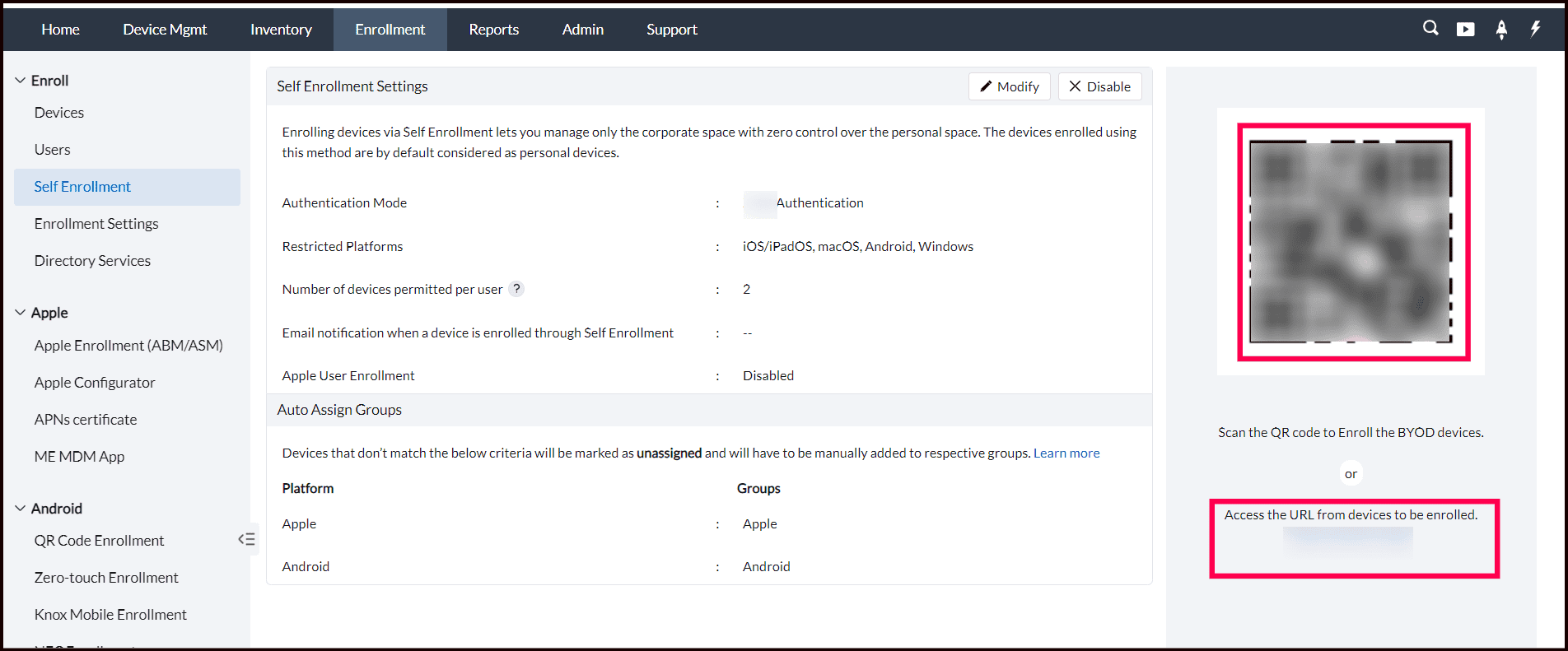 After completing the Self Enrollment configuration, an Enrollment URL and a QR code will be provided. These are the primary tools users will use to enroll their devices, whether they are on iOS, Android, or Windows platforms. Users can either scan the QR code or access the Enrollment URL from the device they wish to enroll. The enrollment remains consistent across all supported platforms, ensuring a seamless experience for users.