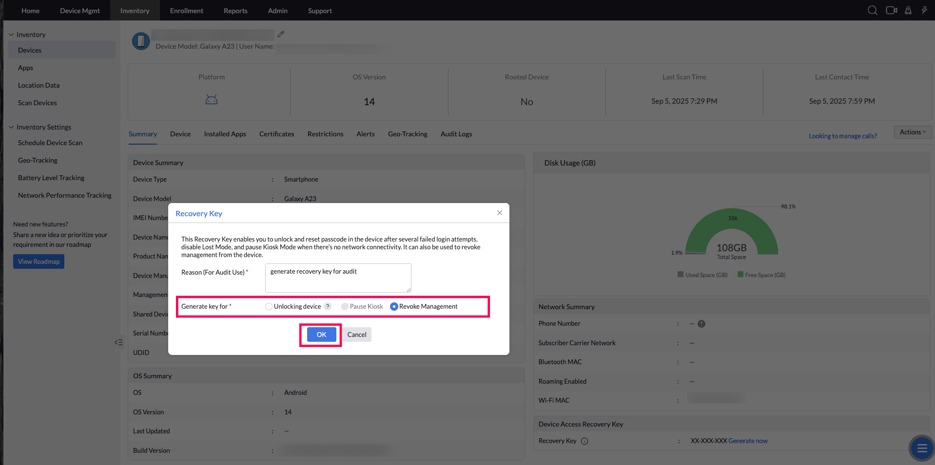 Revoke Administration Password has been enhanced as Device Access Recovery Key. MDM provides a recovery key to regain access and revoke management on devices that are offline or unresponsive. This key acts as a secure backup when standard authentication methods fail. Follow the steps mentioned below to create a Recovery Key: