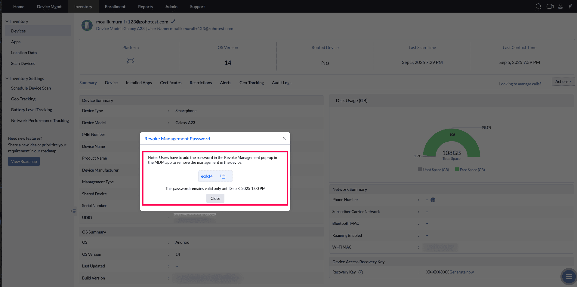 - On the MDM console, navigate to Inventory->Devices->Click on the Device Name to open the device details->On the Summary Page->Device Access recovery Key. Click on the Generate Now option to Generate the Recovery key.