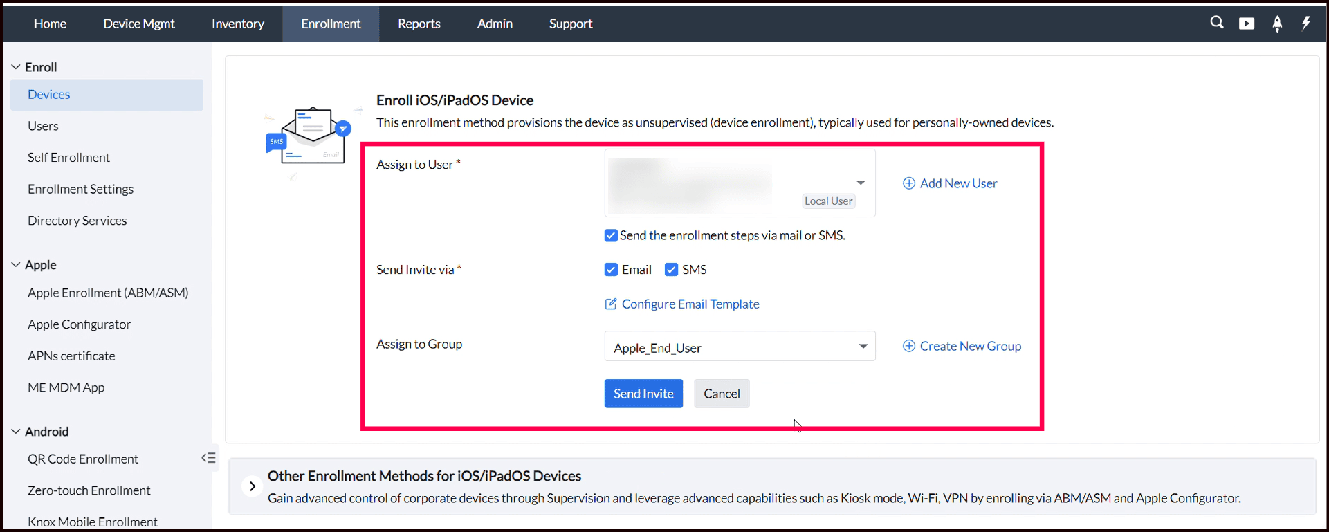 - Check the "Send the enrollment steps via mail or SMS" checkbox and choose the method for sending the enrollment invite with the necessary steps to complete their device enrollment.: