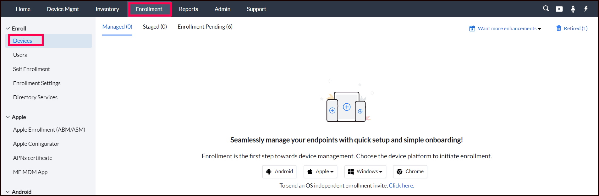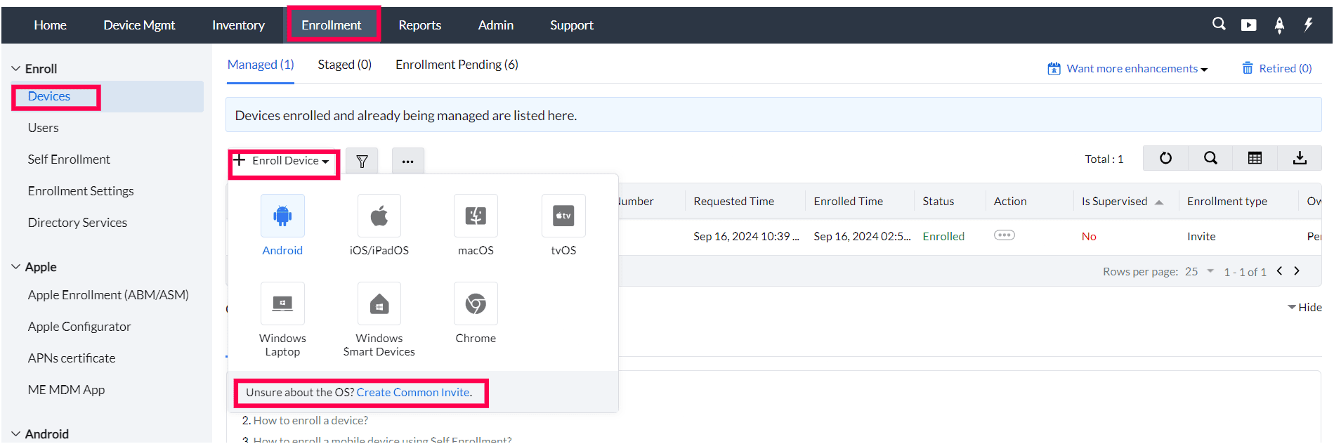 - For Creating Common Invite when not sure about the OS, Click on "+Enroll Devices" in the Managed section. Next, click on the "Create Common Invite" hyperlink located next to "Unsure about the OS?" The Create Common Invite feature allows you to enroll any device, regardless of its operating system—be it Android, iOS, iPadOS, macOS, or Windows.