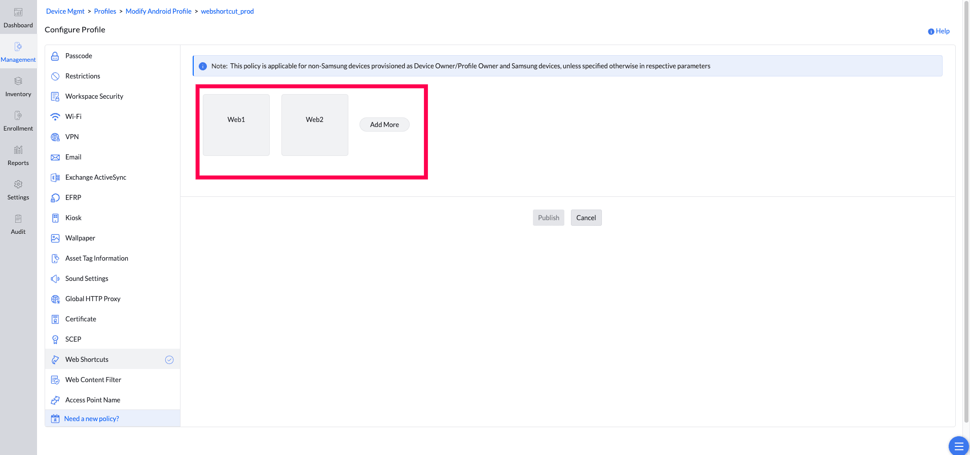 - Web Shortcuts can be configured with Kiosk if the only purpose of the managed device is to display the contents of a URL.