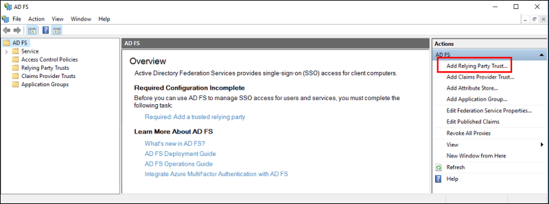 - In the Action side bar, select Add Relying Party Trust. The Add Relying Party Trust Wizard will open.