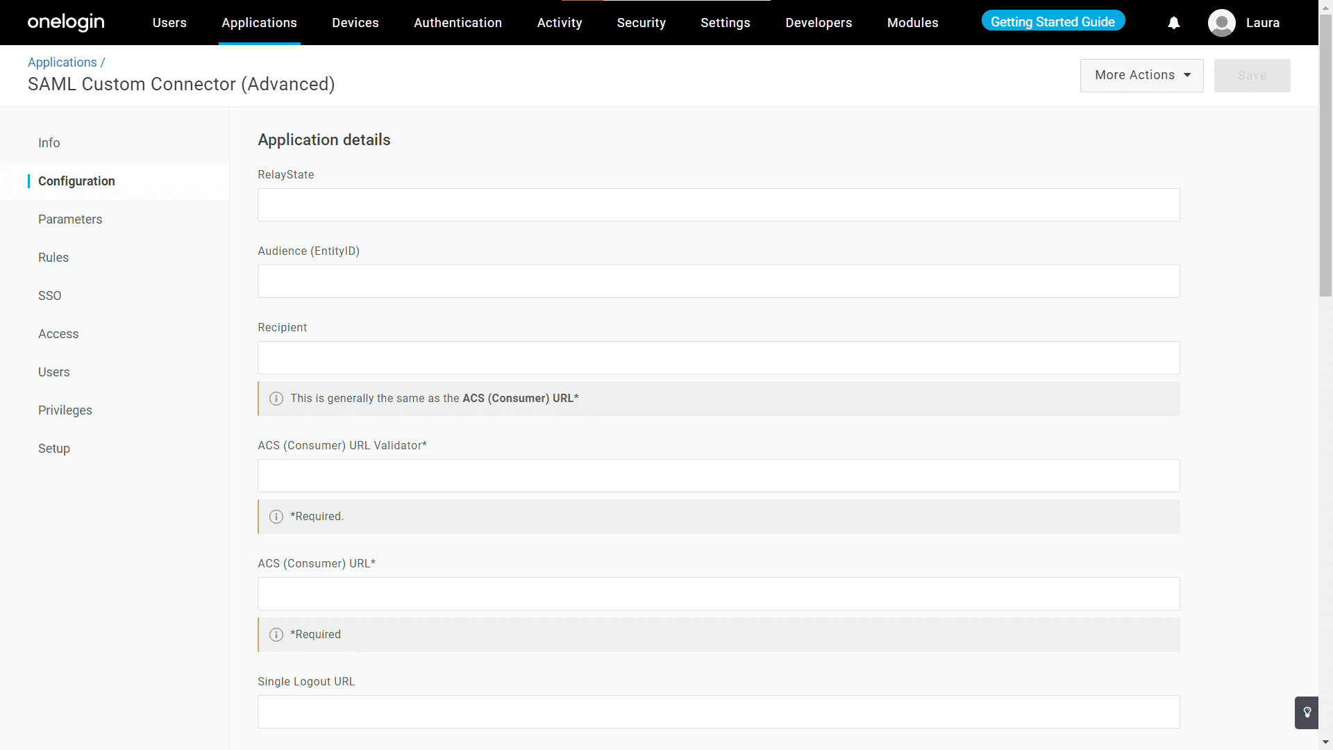 - In the Configuration tab, fill in the Recipient, Audience (EntityID), and ACS URL fields.