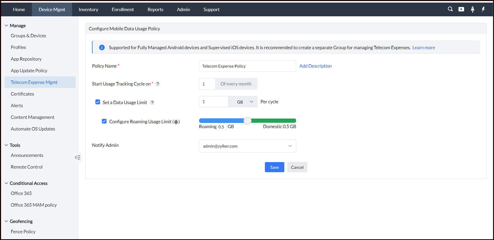 - Groups: We recommend creating a separate Device group for applying the Telecom Expense Policy. This group can be associated with a Telecom Expense policy pertaining to the organization's requirements. The overall data usage can be tracked and generated in the form of a report.