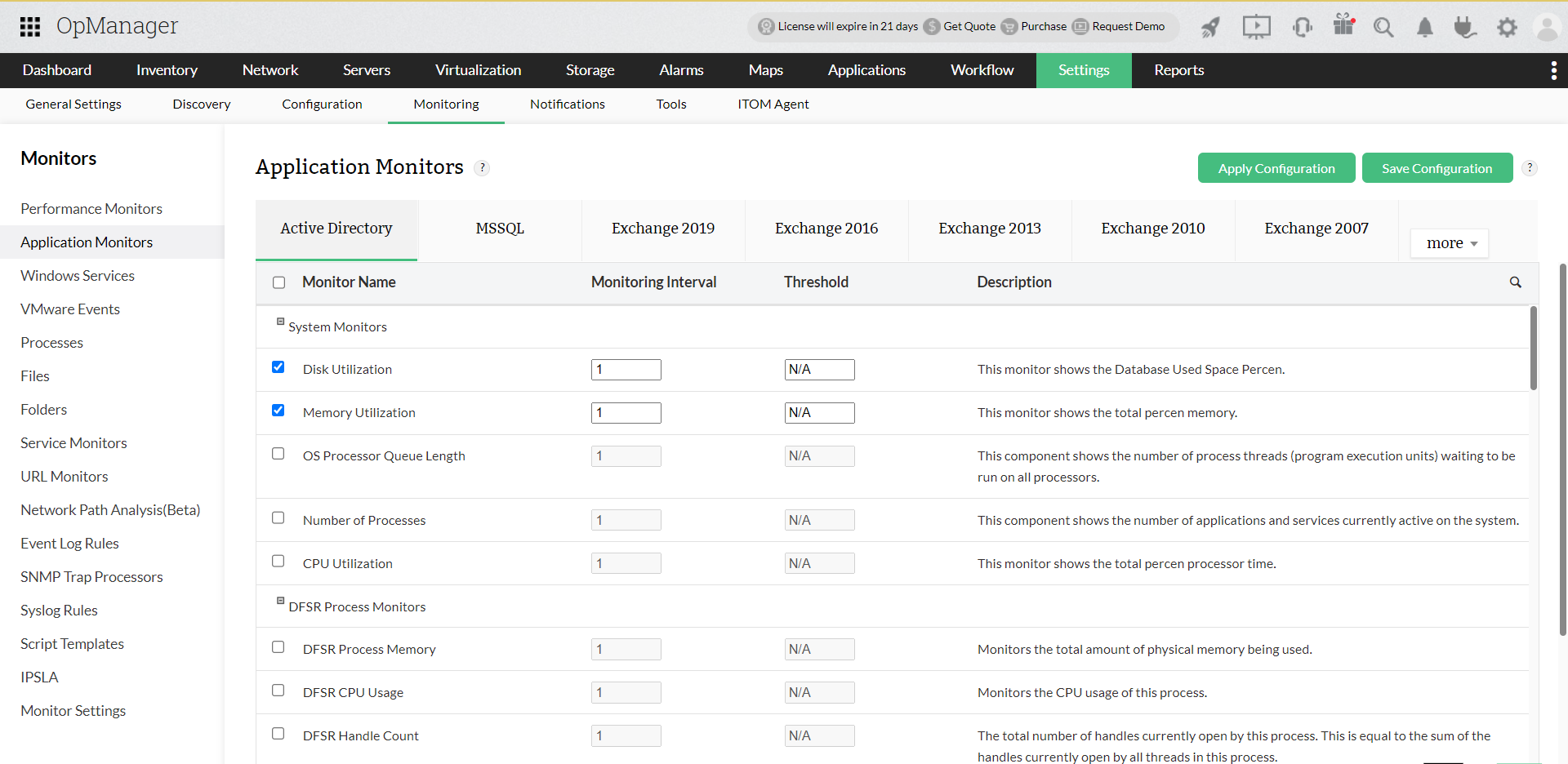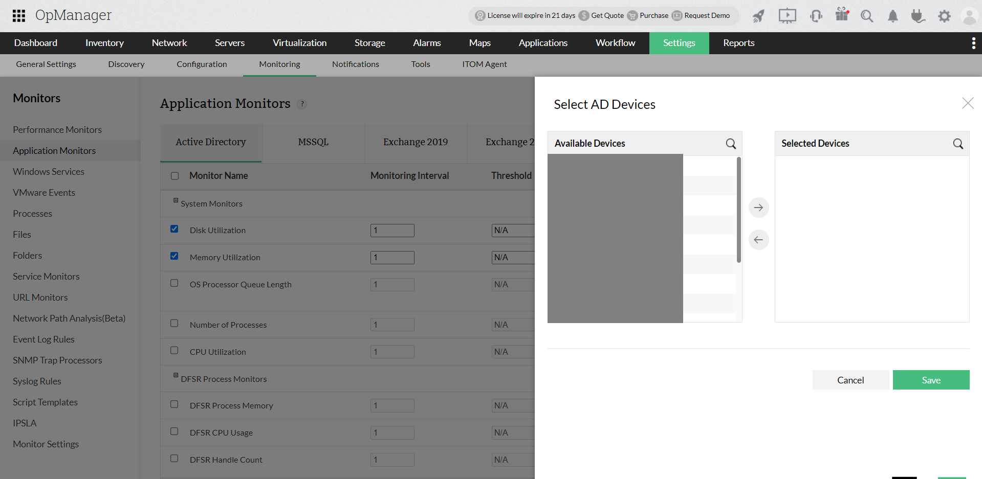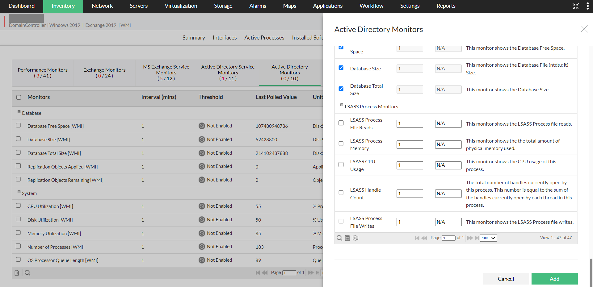 - Under the "Active Directory", select the monitors you want to associate. You can even modify the monitoring interval and thresholds under the respective columns.
