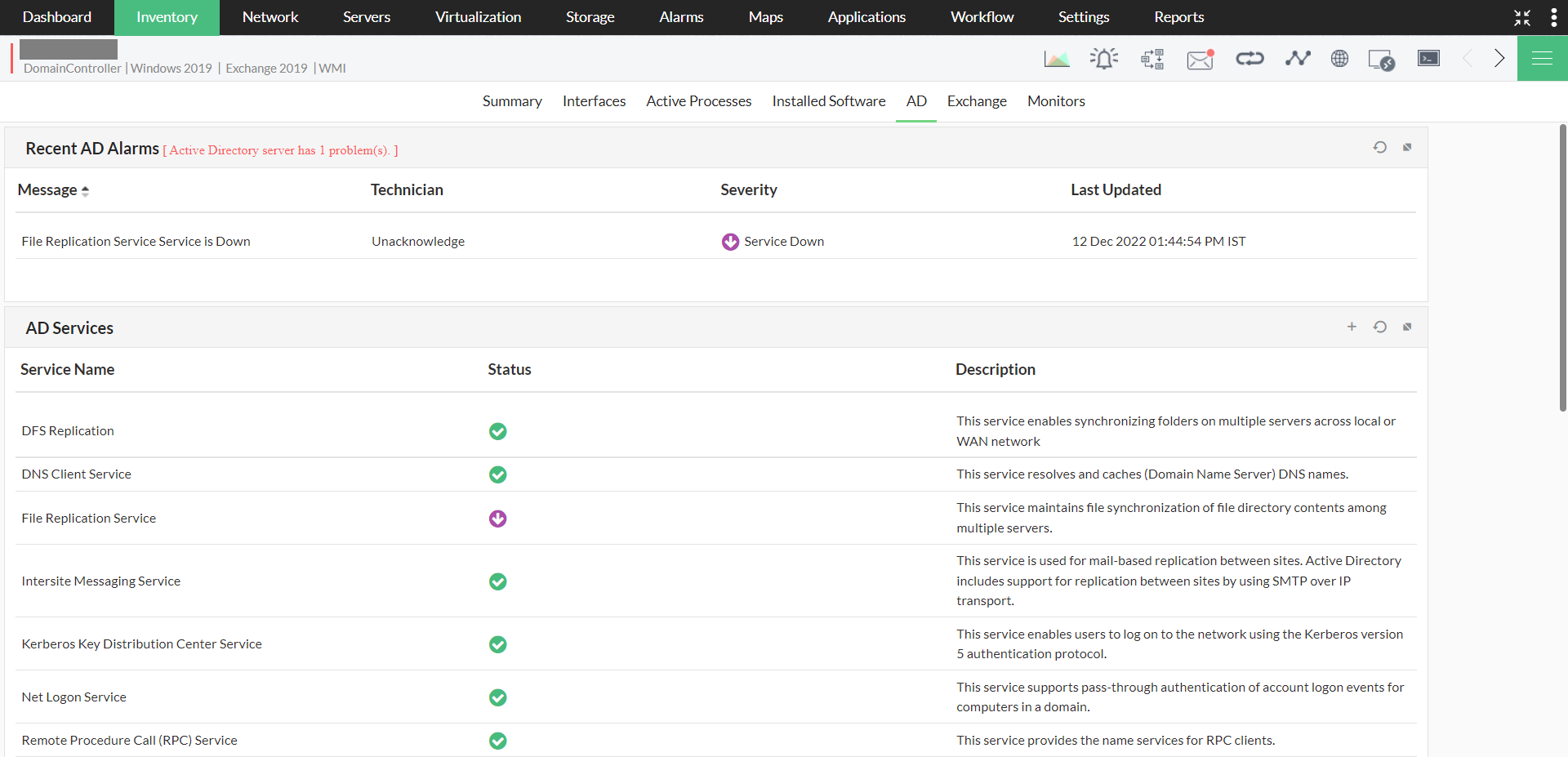 To make AD monitoring more simple and easily accessible, The Domain Controllers are classified under a separate category under Infrastructure Views. The categorization of the device as a Domain Controller is done automatically if SNMP is enabled. The system resources of the device and the AD services are monitored using WMI. Kindly note that users can monitor AD services with the privileges needed for WMI and don't need any separate privileges for the same.