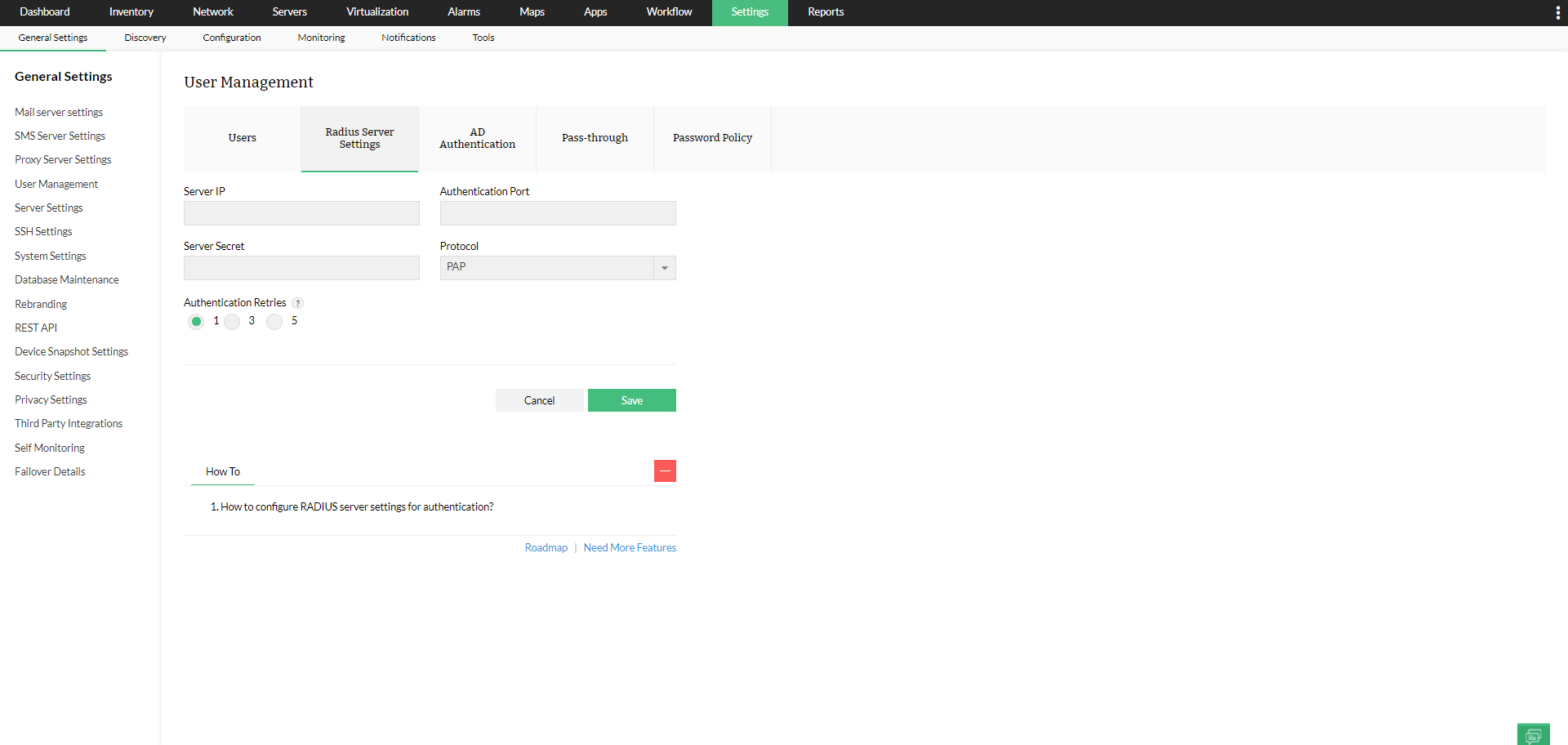 To configure radius server settings, go to Settings -> General Settings -> Authentication -> Radius Server Settings and enter the required details: