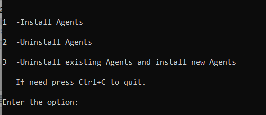 The tool displays 3 options. You can choose to install, uninstall or reinstall the agent. Enter the option chosen.