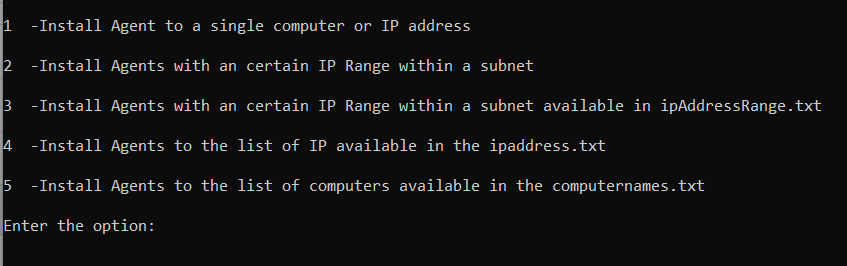 The tool displays 5 options. You can choose the desired option to install, uninstall or reinstall the agent. Enter the option chosen and follow the instructions provided for successful deployment of the agent.