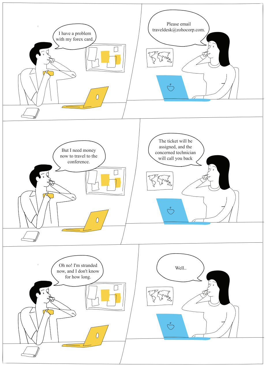 The element of personal interaction is always a crucial part of delivering a good experience. Though ServiceDesk Plus and Zoho Expense streamline the process of travel requests, a traveler’s experience is complete only when they can chat with the right people at the right time.