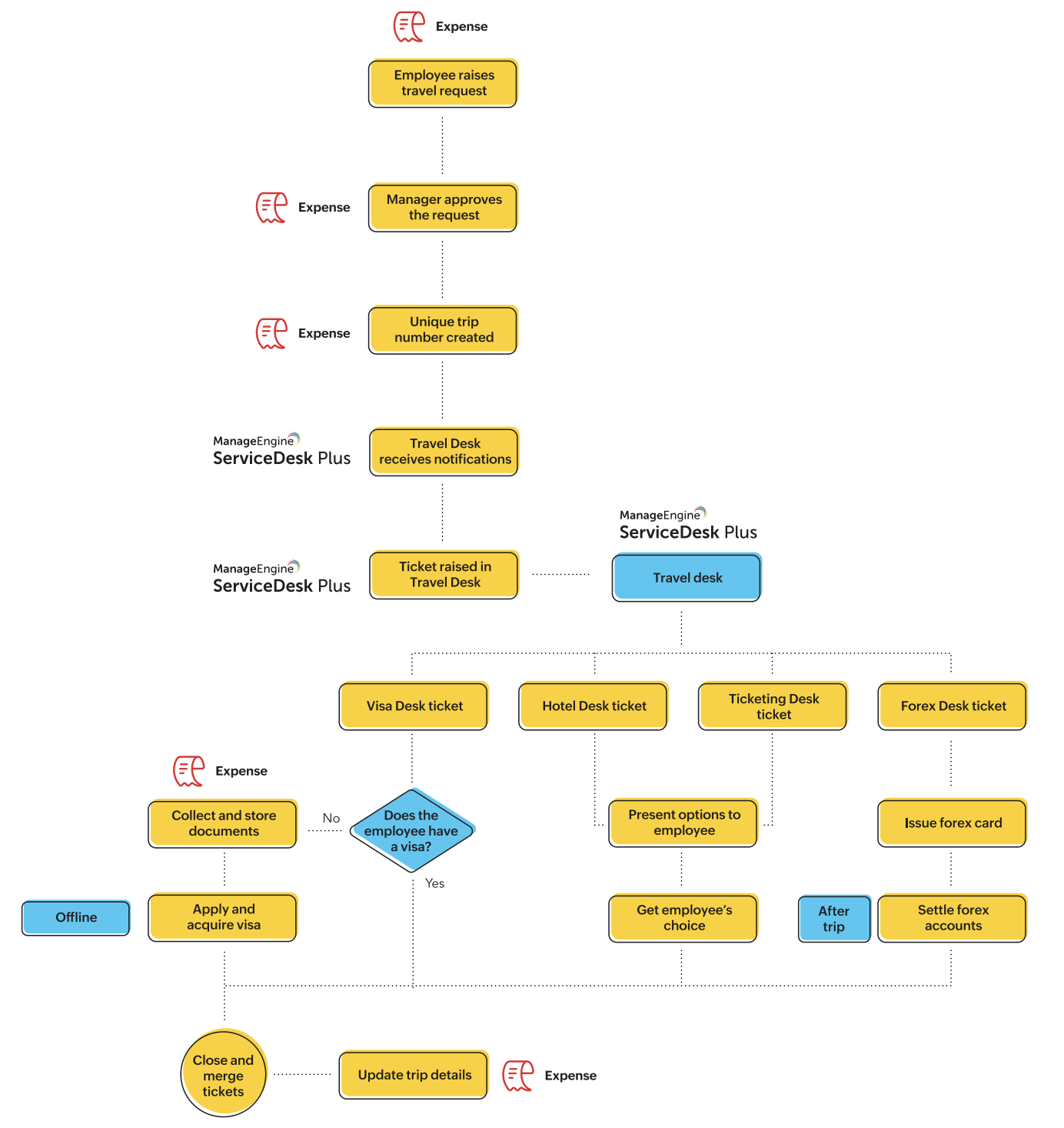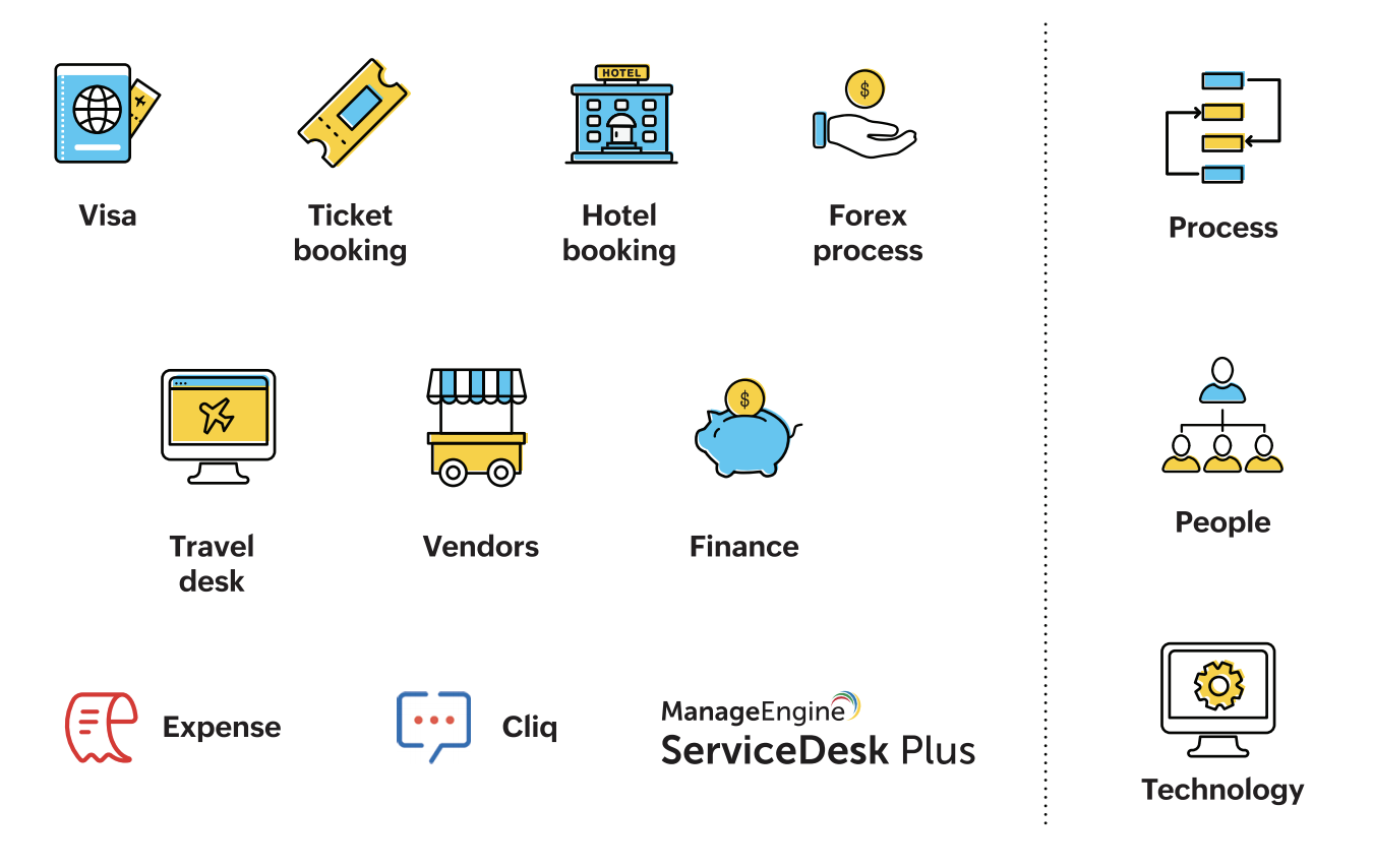 The two main tools used for travel requests, Zoho Expense and ServiceDesk Plus, are equipped enough to take care of different functions. Zoho Expense collects all trip-related details in one portal, while ServiceDesk Plus facilitates all communication and processes between the Travel Desk and the traveler.