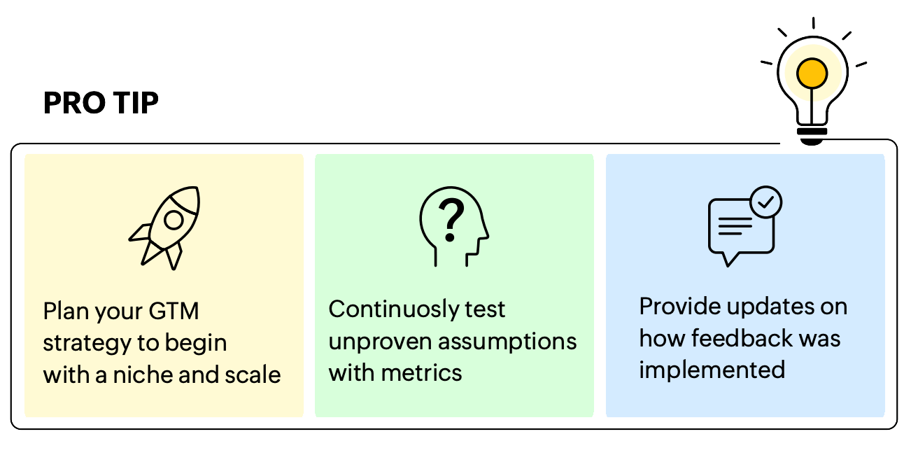 Once an MVP is built and introduced to real users, product teams must validate that the prototype works as intended. This can be done by monitoring metrics like user retention, session duration, and feature usage. Additionally, gathering qualitative feedback through focus groups, beta testing, and A/B testing can help PMs gain insights into their experiences and determine which user flow works best. Lastly, iteration. Look out for recurring themes and patterns in user feedback and prioritize those issues.