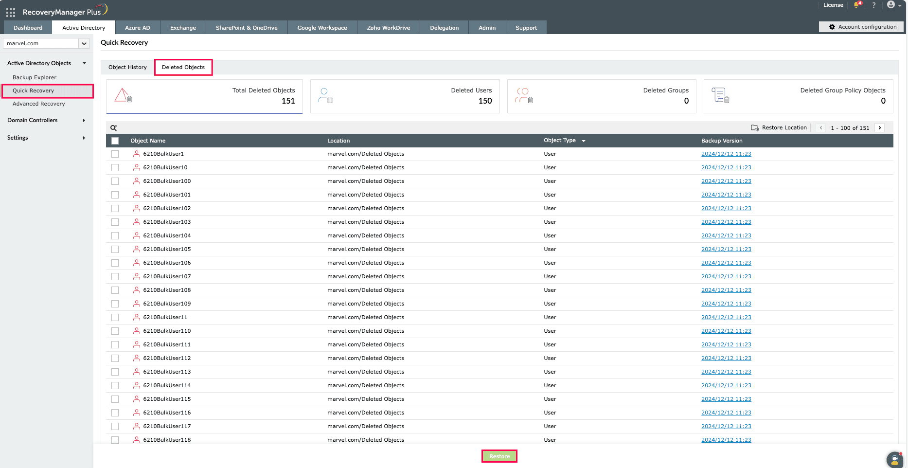 Figure 1: Restoring deleted AD objects using RecoveryManager Plus