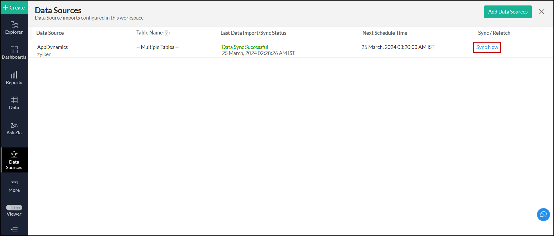 - Open the required workspace, and click the Data Sources option from the side panel.