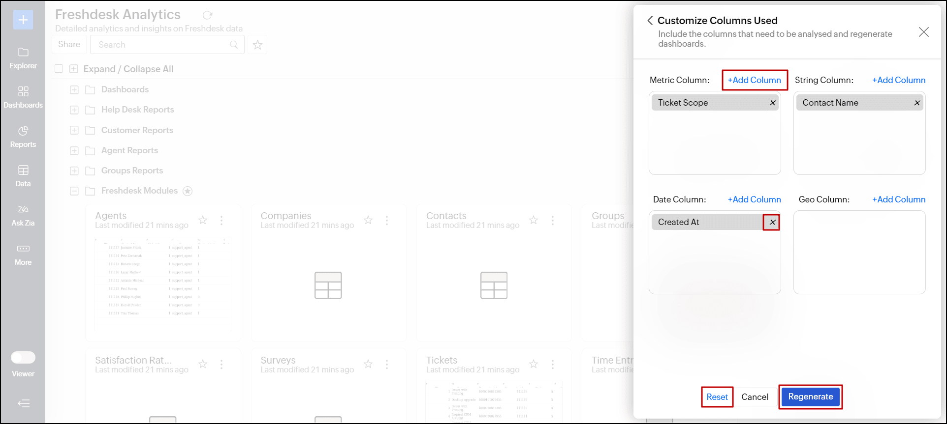 Columns are categorized based on their data type for easy navigation. Click + Add Column to include additional columns in your analysis, and use the remove icon to exclude any columns from the report. Click Regenerate to generate dashboards based on the changes made. Click the Reset link to revert to the original settings.