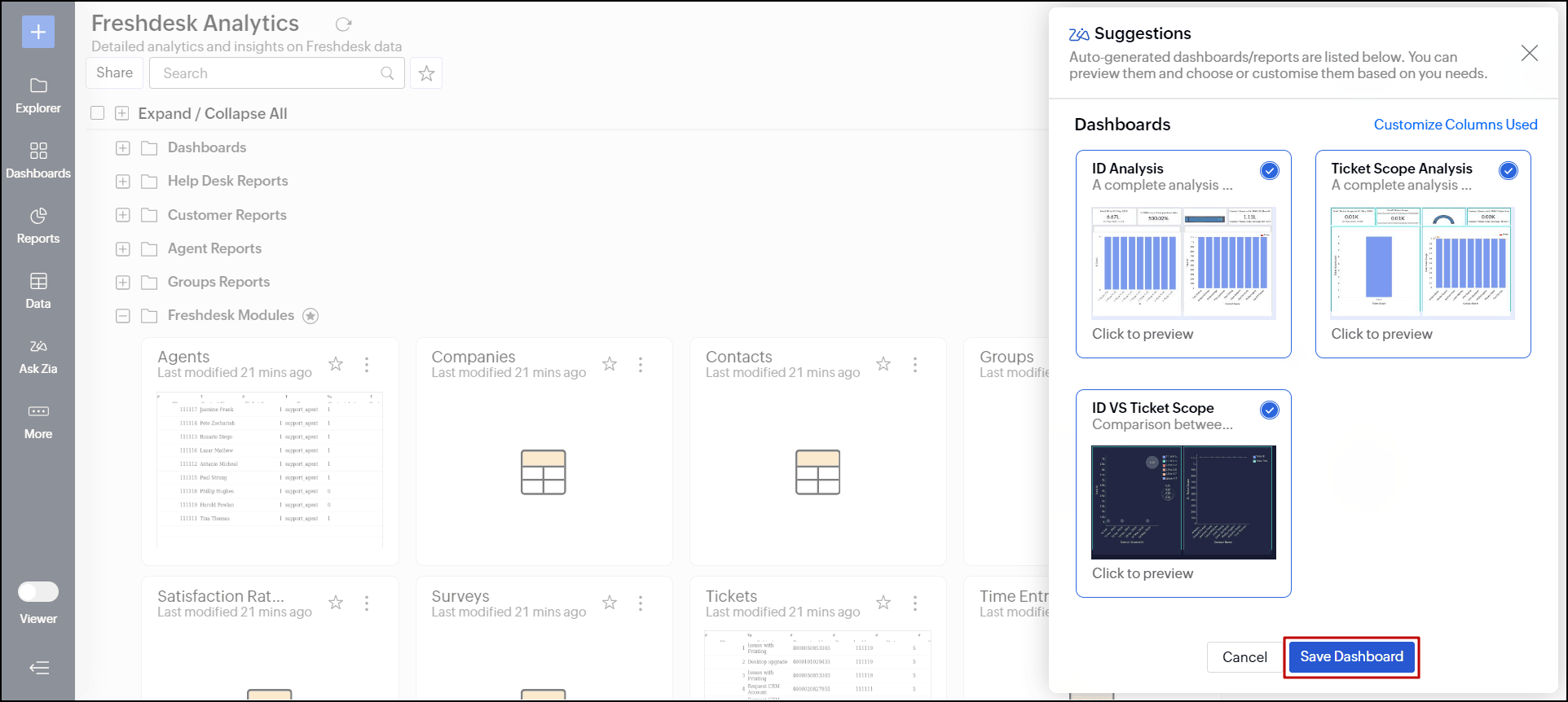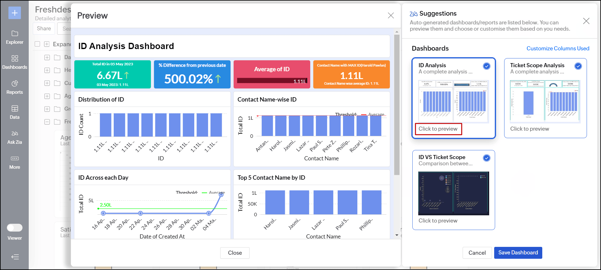 Analytics Plus allows you to auto-generate reports and dashboards effortlessly. You can customize the reports later based on your evolving requirements. Follow the steps below to do this.