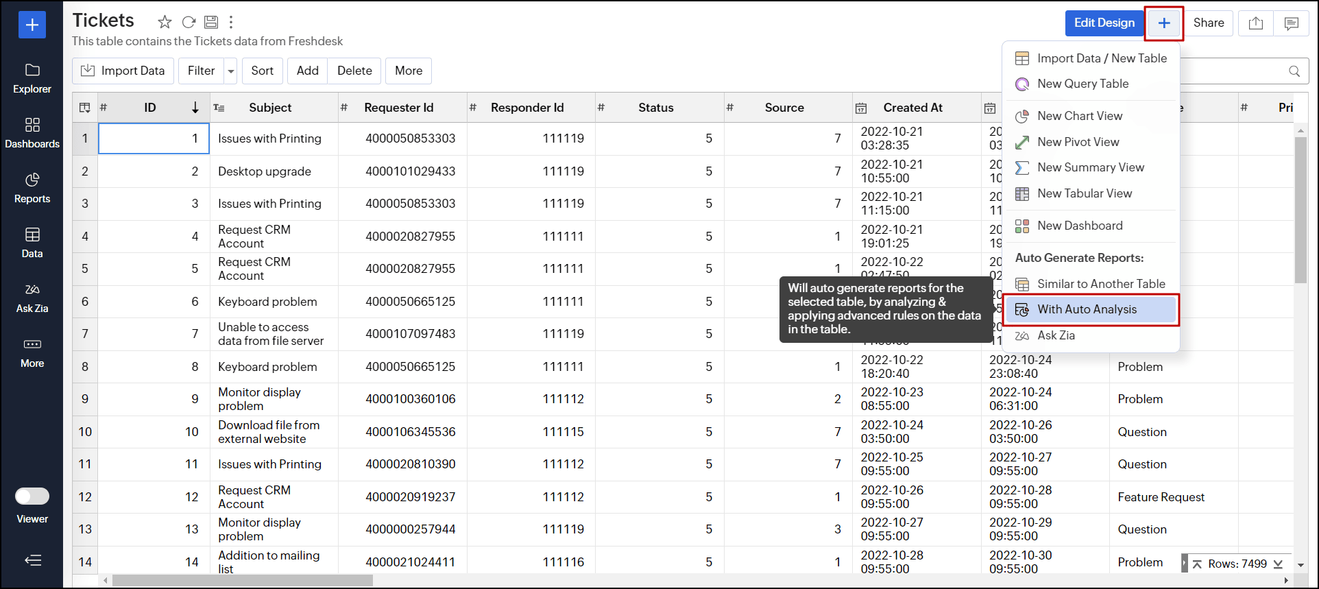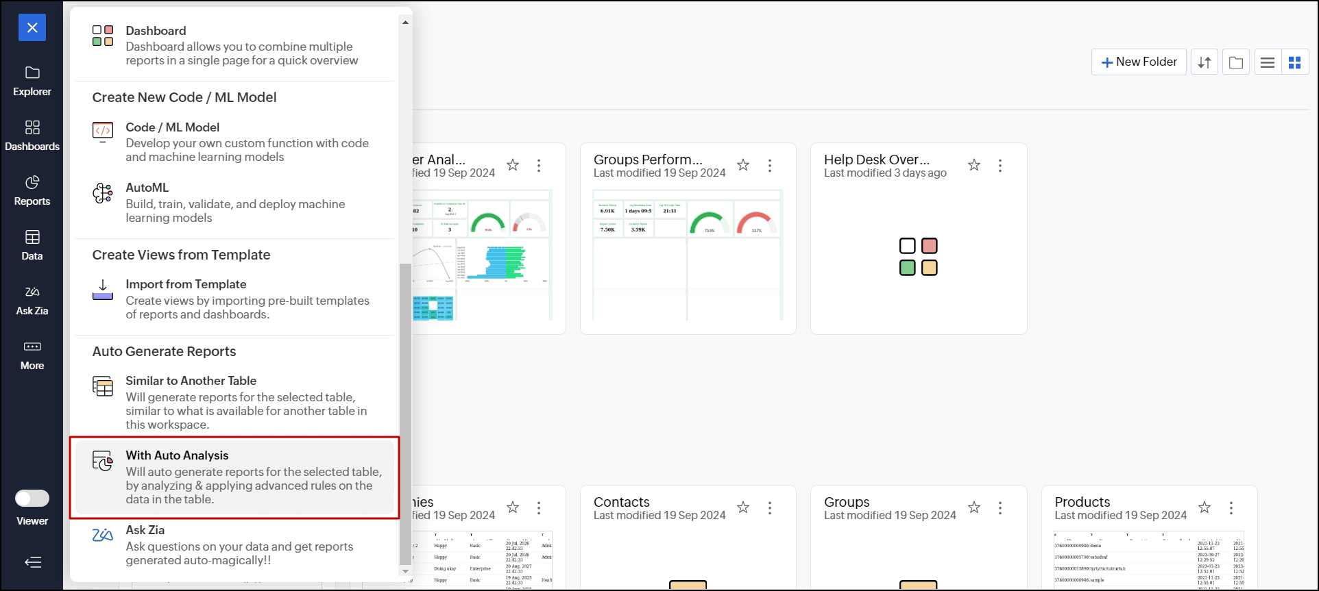 From the table view: Open the desired table for which you need to auto-generate reports and dashboards, click the + (Create New) button, and choose the With Auto Analysis option.