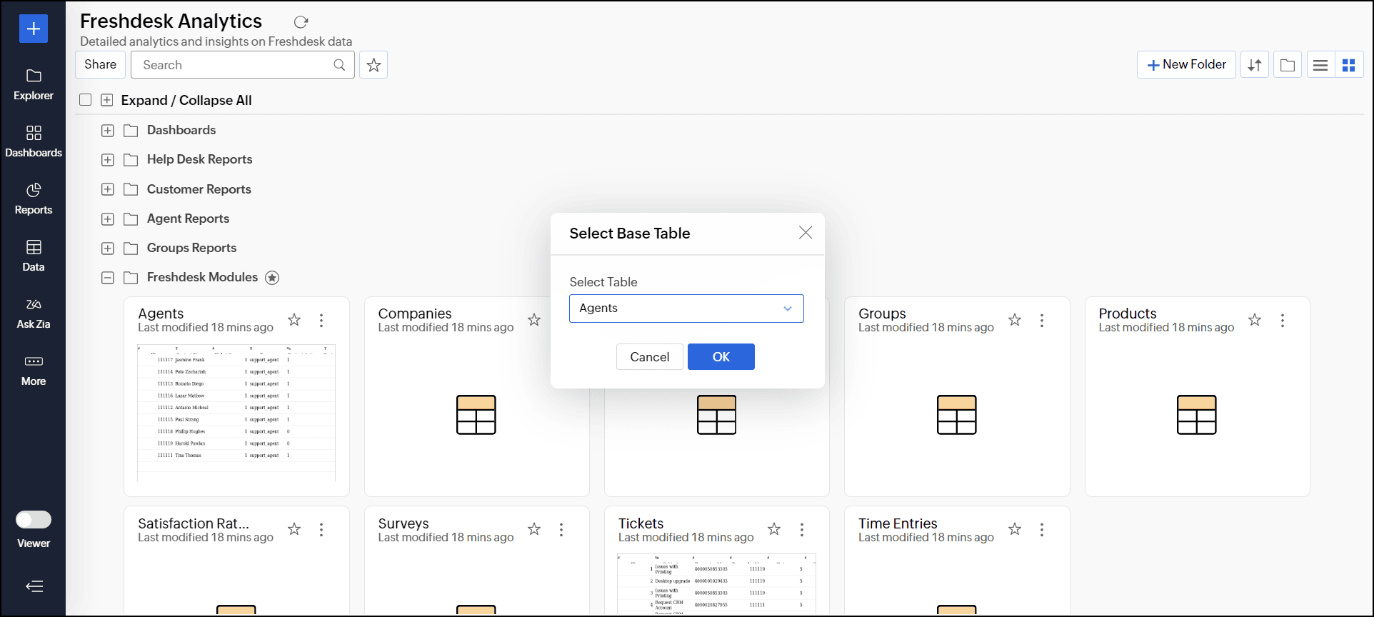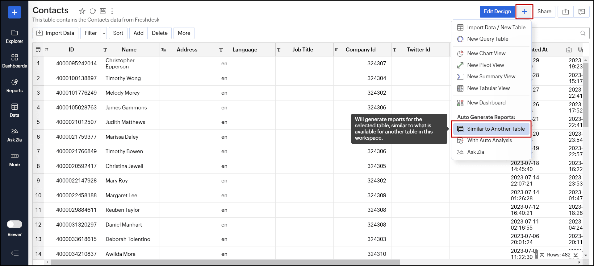 You can also do this from the Explorer window, click the + (Create) button on the left side panel, and choose the Similar to Another Table option. In the pop-up that appears, select the table for which you need to generate reports from the Select table to generate reports drop-down.