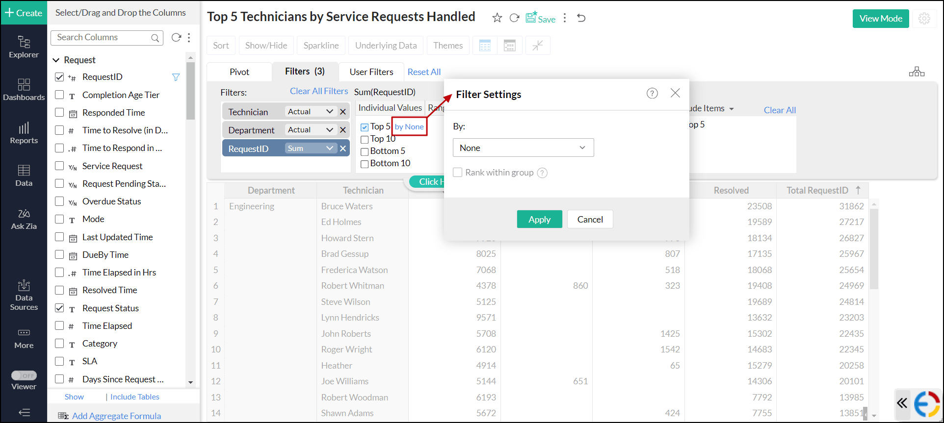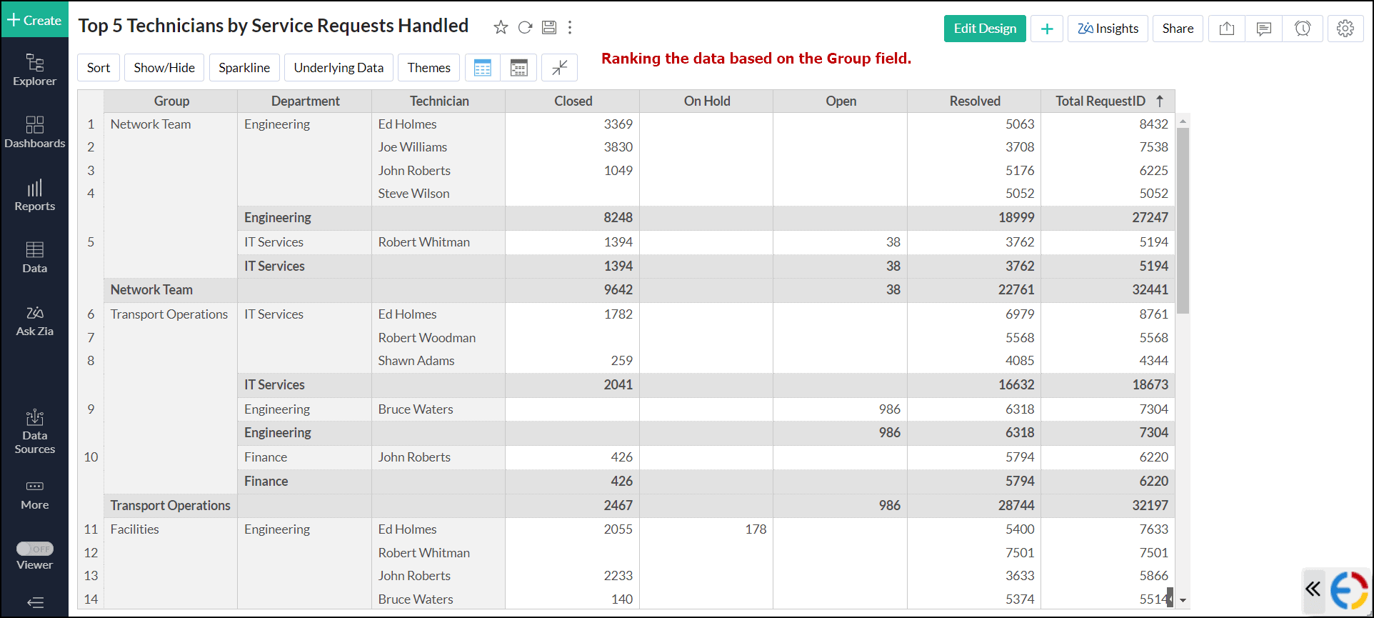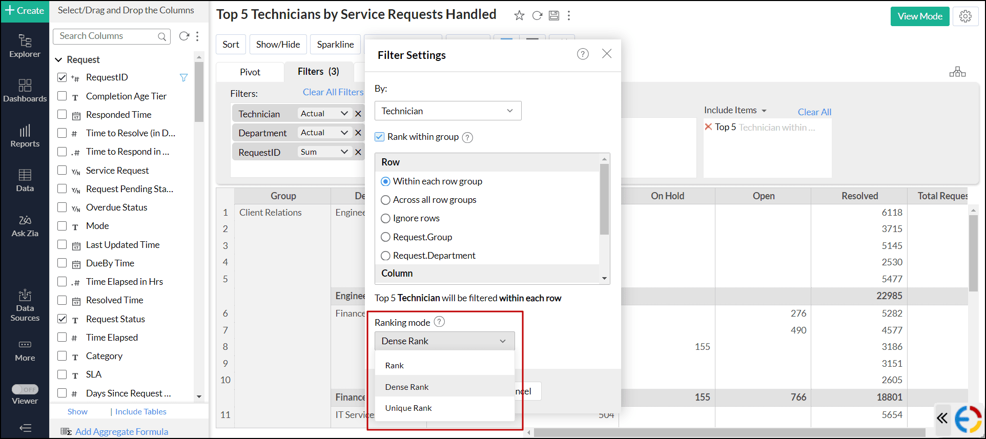 • Fields used in the report: This option allows you to rank the data based on the fields added above the primary field selected for ranking in the designer shelf. In the example below, the Group and Department field is added above the Technician field (the primary field selected for ranking) in the designer shelf.