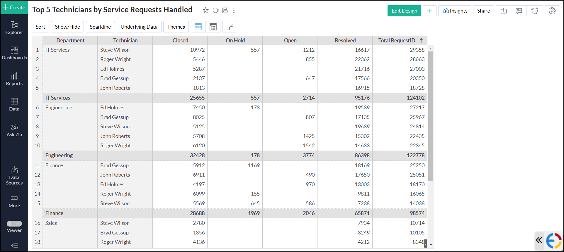 • Open the required chart in Edit Design mode or create a new one. For instance, let's create a pivot view to visualize the Top 5 Technicians in each department based on the number of service requests they have handled.
