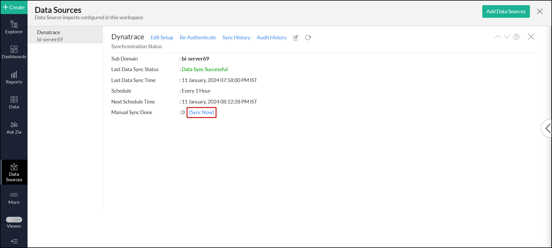 • Open the required workspace, and click the Data Sources option from the side panel.