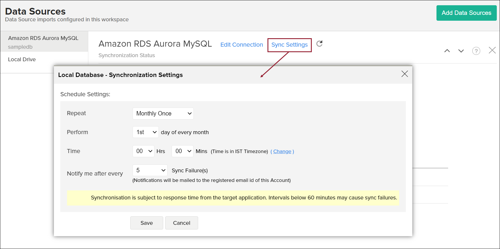 Click Save. The data from your Amazon RDS Aurora MySQL database will be imported into Analytics Plus in the specified intervals.