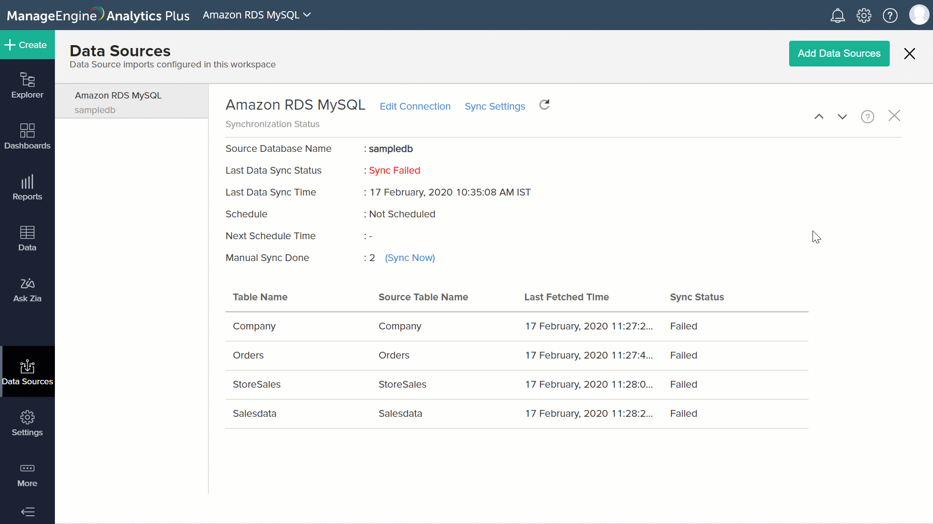 If you have created reports in Analytics Plus over columns or tables that don't have a direct mapping to the data in the database, mismatches will occur. These mismatches will be listed in the Cloud Database Connection Settings page, which can be accessed by clicking the Data Sources button from the side panel. Refer the following question to know more.